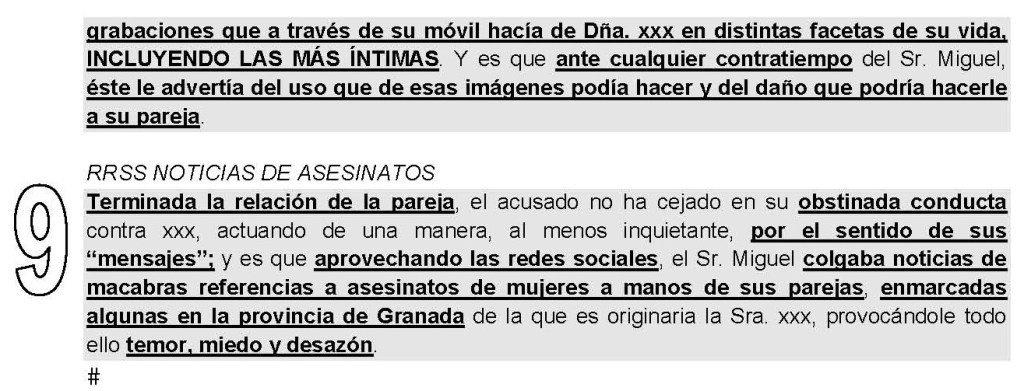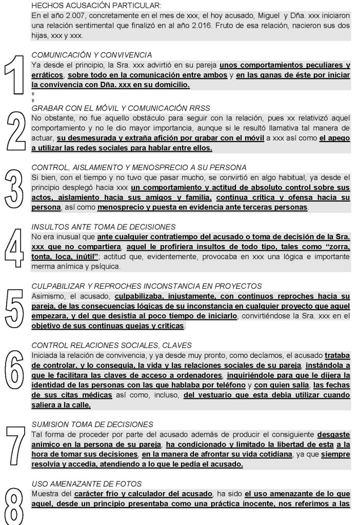La acusada ha depuesto en el plenario que mantuvo una relación sentimental con don Miguel durante un año, que en octubre de 2017 mantenían una relación, pero no eran pareja, que le envió mensajes y le hizo llamadas, que no era consciente de la gran cantidad de llamadas, añadiendo que reconoce las llamadas, que tiene síntomas de dependencia emocional derivadas de la violencia de género, que reconoce los hechos, que recibió una paliza, que se le destrozó la casa, que fue al hospital y se celebró el juicio, niega haber golpeado a don Miguel, añadiendo que sólo se defendió, niega haberle golpeado en el ojo, que don Miguel le pegó una gran paliza, que la casa es de dimensiones pequeñas, afirmando que «algún golpe le cayó», pero que no fue aposta, que estaba intentando aplacar los golpes, contestando, a preguntas del letrado de la acusación particular ha negado haberse autolesionado, niega haber pegado patadas a la puerta de la casa de don Miguel, contestando a la pregunta de cómo era posible que si don Miguel la estaba agrediendo él tuviera lesiones en la espalda, que «si pegas palizas de semejantes dimensiones, uno mismo se acaba haciendo daño» y, a preguntas de su letrado ha manifestado que en octubre de 2017 la relación sentimental era tóxica, que había una manipulación psicológica, que unas veces le contestaba y otra no.